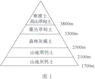 祁连山东南端地处半湿润区向半干旱区过渡地带,山地北坡表层土壤有机质含量随海拔升高先增加后减少。图 1 示意祁连山东南端山地北坡表层土壤垂直分布状况。据此完成 1~2 题。