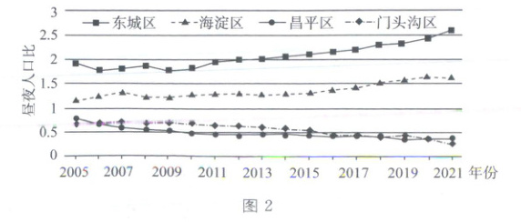 随着城市规模扩大,城市核心区与周边各区县之间出现职住分离现象,表现为“工作区”和“睡城”两种状态。昼夜人口比(白天人口与夜间常住人口的比值)可直观反映地区的职住分离情况。图 2 示意 2005—2021 年北京市部分区县昼夜人口比的变化。据此完成 3~5 题。