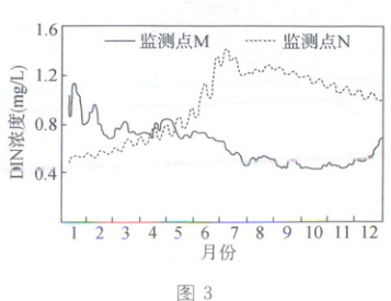 6. 监测点 M 冬季 DIN 浓度达全年峰值,主要是由于冬季