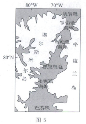 内尔斯海峡南连巴芬湾,北通林肯海,由多个海峡和一个海盆组成,是北冰洋海冰输出的重要通道。冬季,流动的浮冰受阻并与沿岸固定冰结合,形成横跨内尔斯海峡的冰桥。在盛行风作用下,冰桥某一侧易形成冰间湖(无冰或仅覆薄冰的开阔水域)。图 5 示意内尔斯海峡概况。据此完成 11~12 题。