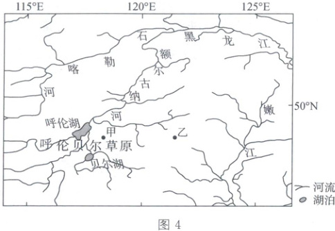 返青期是植物在休眠后,随着环境条件改善,叶片重新萌发或颜色由黄变绿,进入快速生长的一个阶段。返青期的提前或推迟对草原生态系统有明显影响。研究发现,2001—2015 年呼伦湖西部的草原植被返青期呈推迟趋势。图 4 示意呼伦贝尔草原及周边水系。据此完成 8~10 题。