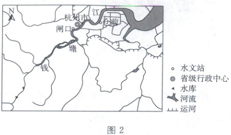 钱塘江河口闸口—仓前河段咸淡水混合强烈,影响城市生活供水,该河段水体氯度(盐度指标)受径流、潮汐和河床冲淤共同影响。监测数据表明:由闸口至仓前,水体平均氯度逐渐增加;连续丰水年、枯水年,水体氯度较小,但径流由丰转枯的第一年,氯度显著上升。图2为钱塘江局部河口示意图。据此完成7~9题。