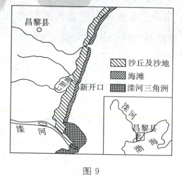 (2)滦河挟带泥沙在入海口处沉积,形成滦河三角洲;(2分)夏秋季节,在西南风的吹拂下,滦河三角洲沉积的泥沙被海浪侵蚀、搬运,沿着海岸线向北运移,到达翡翠岛东部海域,搬运能力下降,大量泥沙沉积下来,形成海滩;(2分)冬春季节,降水少,干燥的海滩上的沙粒易被强劲的东北风侵蚀,向西搬运,在海岸附近堆积形成海岸沙丘地貌。(2分)