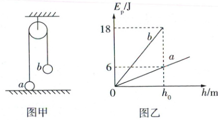 10. 【2026届福州高三一测】如图甲所示,可视为质点的a、b两球通过跨过光滑轻质定滑轮的轻绳连接,a球在外力作用下静止于地面,b球距离地面高度为h₀。以地面为零势能参考面,现静止释放a球,在a球到达最高点前的过程中,a、b两球的重力势能随离地高度h的变化关系如图乙所示,已知在t=0.3s时两球重力势能相等,a、b始终在竖直方向上运动,a球始终没有与定滑轮相碰,b球不反弹,忽略空气阻力,重力加速度g=10m/s²。则