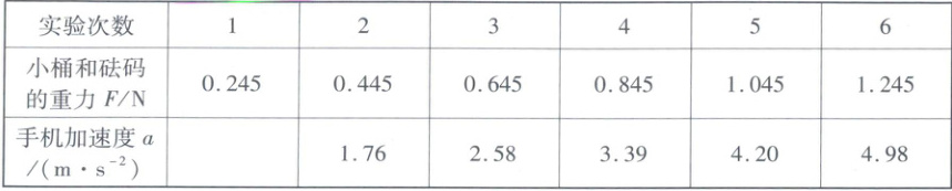 (5)保持小桶和砝码的质量不变,用双面胶把不同数量的配重片贴在手机背面,重复步骤(3),测得实验数据并作出$a-\frac{1}{M}$图像,得出结论:当合外力一定,加速度与物体质量成反比。