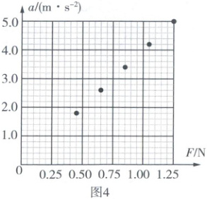 根据图3软件截图,上表中空白处的数据为m/s²。利用数据作出a-F图像,在图4中描出第一组数据的点并连线,可以得到结论:。