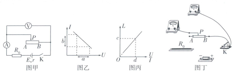 12. 【2026届陕西省高三开学摸底】(8分)实验小组用如图甲所示的电路来测量电动势为E,但内阻未知的干电池的内阻r,同时测量一段粗细均匀,电阻率为ρ的圆柱状电阻丝AB的横截面积S,图中的电压表内阻极大,电流表内阻极小,定值电阻的阻值为R₀,合上开关K,调节滑片P,记录电压表、电流表的相应示数U、I,以及相应的PB间的长度L,绘制出的I-U图像如图乙所示,$L-\frac{U}{I}$图像如图丙所示。