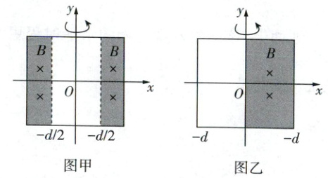 7.【2026届青岛高三调研】如图甲、乙所示,在$-d\leq x\leq d$、$-d\leq y\leq d$区域的阴影部分,存在垂直$xOy$平面向里的匀强磁场,边长均为$2d$的正方形线框与磁场边界重合。两线框以$y$轴为转轴、以相同角速度匀速转动,则甲、乙中线框产生感应电动势最大值之比为