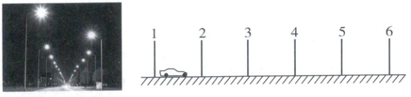 4. 如图所示,1 ~ 6为平直公路旁间距相等的路灯柱,一小汽车(可视为质点)从1、2两路灯柱之间的某位置以一定的初速度做匀减速运动,到达路灯柱6时停止运动。现将该车的初速度减半,从相同位置出发以相同的加速度做匀减速运动,则该车停止运动时的位置在