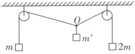 5. 如图所示,某同学想在家里悬挂一些玩偶做装饰,他在天花板下方相隔一定距离安装了两个完全相同的光滑轻质定滑轮,足够长轻质细绳跨过两定滑轮连接两个质量分别为$m$、$2m$的小玩偶。为使这两个小玩偶能保持静止,他又将一个质量为$m'$的小玩偶用轻绳系在$O$点,则$m'$可能等于