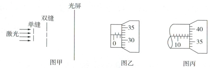 。(2)当双缝和光屏之间为真空时,将测量头的分划板中心刻线与第1条亮纹中心对齐,此时手轮上的示数如图乙所示,当分划板中心刻线与第6条亮纹中心对齐时,手轮上的示数如图丙所示,则相邻亮条纹中心的间距$\Delta x_1 =$