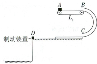 15.【2026届广东高三9月联考】(17分)某工厂需要将货物从高处运输到地面的指定位置,运输过程可简化如图所示。长度$L_{1}=6m$的水平传送带以大小$v=5m/s$的速度顺时针匀速转动,质量$m=2kg$的货物(可视为质点)从传送带的左端$A$点由静止释放,经过右端$B$点后,从半径$R=4m$的半圆管道的最高点水平进入,当货物沿管道下滑至$C$点时,货物对管道的压力大小$F=70N$,随后货物滑上静止在光滑水平面上的长木板,当货物与长木板达到共速时,长木板左端恰好触碰制动装置,并瞬间静止。已知货物与传送带间的动摩擦因数为$\mu_{1}=0.25$,货物与长木板间的动摩擦因数为$\mu_{2}=0.5$,长木板的质量$M=3kg$,长度$L_{2}=6.7m$,重力加速度$g=10m/s^{2}$。