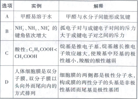 [深度解析]甲醛中O原子可与水分子中的H原子形成氢键,所以甲醛易溶于水,A正确;NH₂、NH、NH⁺中N原子均为sp³杂化,NH₂含2个孤电子对,NH含1个孤电子对,NH⁺中无孤电子对,孤电子对与成键电子对间的斥力大于成键电子对之间的斥力,所以NH₂的键角最小,NH⁺的键角最大,B正确;烷基是推电子基,烷基越长推电子效应越强,使得羧基中O—H键的极性减小,而不容易给出H⁺,酸性减弱,C正确;细胞膜为磷脂双分子层,由亲水的极性头部(含磷酸基团)和疏水的非极性尾部(脂肪酸链)构成,D错误。