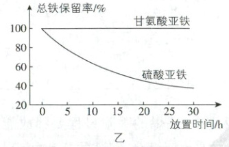(6)对比图乙中两种物质的总铁保留率,甘氨酸亚铁保留率更高,结合已知③螯合效应提高配合物的化学稳定性可知甘氨酸亚铁因螯合效应,稳定性强于硫酸亚铁,含有的Fe²⁺不易被氧化,也不易水解。