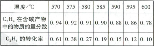 (4)①反应ⅱ、ⅳ均为放热反应,升高温度,反应ⅱ平衡逆向移动程度更大,导致乙烯在含碳产物中物质的量分数降低。②初始充入1molC₂H₆和1molO₂,585℃时,C₂H₆转化率α = 0.19,C₂H₄在含碳产物中物质的量分数为90%,含碳产物为C₂H₄和CO,设平衡时C₂H₄的物质的量为xmol,CO的物质的量为ymol,根据碳原子守恒得x+$\frac{1}{2}$y = α×1 = 0.19,且$\frac{x}{x + y}$= 0.9,解得y = 0.02、x = 0.18。平衡时n(C₂H₆)=(1 - 0.19)mol = 0.81mol、n(C₂H₄)= 0.18mol、n(CO)= 0.02mol,由H原子守恒得n(H₂O)=(0.19mol×6 - 0.18mol×4 - $\frac{1}{2}$×0.02mol×2)= 0.21mol,由O原子守恒得,n(O₂)=(1mol×2 - 0.02mol - 0.21mol)×$\frac{1}{2}$= 0.885mol,nₐ=n(C₂H₆)+n(O₂)+n(H₂O)+n(CO)=(0.81 + 0.885 + 0.21 + 0.02 + 0.18)mol = 2.105mol,初始气体总物质的量为2mol,压强为200kPa,平衡时pₐ=$\frac{nₐ}{2mol}$×200kPa = 210.5kPa,p_{C₂H₄}=$\frac{n(C₂H₄)}{nₐ}$×pₐ=$\frac{0.18}{2.105}$×210.5kPa = 18kPa、p_{H₂O}= 21kPa、p_{C₂H₆}= 81kPa、p_{O₂}= 88.5kPa,反应ⅱ的K_P=$\frac{(\frac{p_{C₂H₄}}{p^θ})²×(\frac{p_{H₂O}}{p^θ})²}{(\frac{p_{C₂H₆}}{p^θ})²×(\frac{p_{O₂}}{p^θ})}$=$\frac{0.18²×0.21²}{0.81²×0.885}$