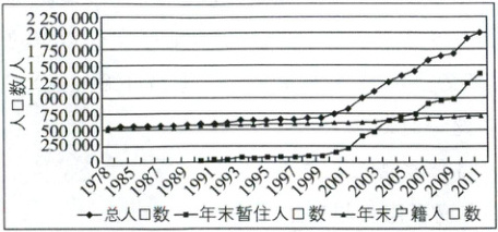 图1显示1978年后昆山总人口数总体呈攀升态势,尤以21世纪初年末暂住人口数增速显著,与年末户籍人口数差距不断变化,这印证了外来人口的大量涌入。(材料中数据分析任答两点,2分)图2显示2011年昆山市各区镇人口数量分布差异,经济技术开发区的总人口数较多,且以外来迁入人口为主。(材料中数据分析2分)