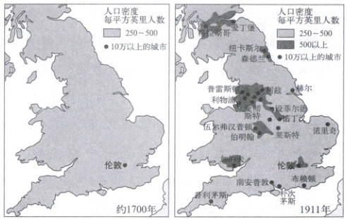 14. 下图是英国部分地区1700年左右和1911年的人口密度分布图(1英里约合1.61千米),1700年只有一座城市人口在10万人以上。1911年,10万人口以上的城市已经有近30座。这一状况表明