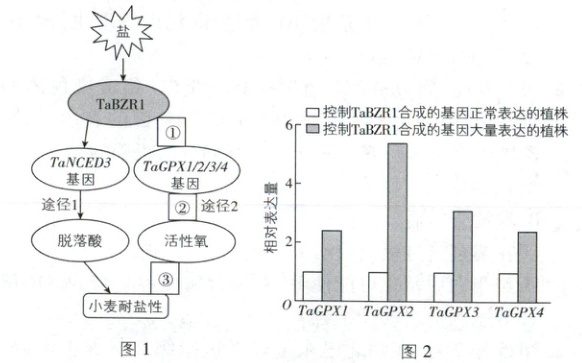 (3)植物中活性氧过度积累会造成细胞膜的损伤。研究人员对盐胁迫下,控制TaBZR1合成基因正常表达和大量表达植株中,TaGPX1/2/3/4基因的表达情况进行了测定,结果如图2所示。根据以上信息,图1中①②③分别是