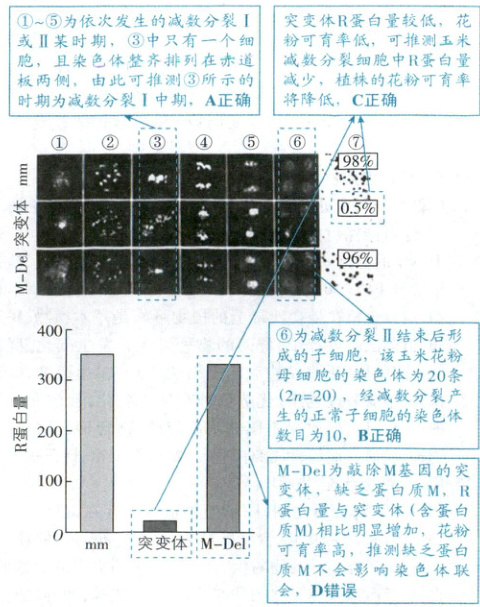 13. 科学家在基因型为mm的普通玉米(2n=20)群体中发现了杂合雄性不育突变体,并从中克隆了控制不育性状的显性基因M(编码蛋白质M)。研究发现,突变体玉米雄性不育与花粉母细胞减数分裂异常密切相关(图1);进一步研究发现,减数分裂细胞中影响染色体联会的R蛋白量与蛋白质M有关(图2)。下列叙述错误的是