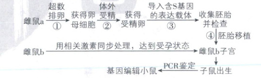 [深度解析]过程①是超数排卵,用促性腺激素处理雌鼠a,可以促使其排出更多的卵母细胞(常考点:使用孕激素对受、供体进行同期发情处理;使用促性腺激素促进供体的超数排卵),A正确;耐高温DNA聚合酶最先是由中国科学家钱嘉韵发现并分离的,B正确;受精卵具有全能性,能发育形成一个完整个体,过程③是将含S基因的表达载体导入受精卵,常用的方法是显微注射法,即将表达载体注射到小鼠的受精卵中,C正确;过程④为胚胎移植,雌鼠b进行同期发情处理后,其子宫对移植过来的胚胎几乎不会发生免疫排斥,D错误。