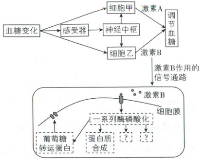 (2)题图中的神经中枢是血糖平衡调节中枢,血糖平衡调节中枢位于下丘脑;据图可知,激素B与细胞表面受体结合后,会促进葡萄糖转运蛋白向细胞膜转移,可推知激素B为胰岛素,则细胞乙为胰岛B细胞,细胞甲为胰岛A细胞,激素A为胰高血糖素(关键点:胰岛B细胞分泌的胰岛素是唯一能降低血糖的激素),血糖降低后,下丘脑的某个区域兴奋,通过交感神经促进胰高血糖素的分泌。胰岛素引起一系列的酶磷酸化后,可以引发的细胞内生理活动包括促进肝糖原和肌糖原的合成,加速葡萄糖氧化分解,促进葡萄糖转化为脂肪等非糖物质从而降低血糖。