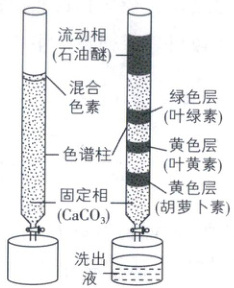 【深度解析】石油醚可作为层析液,说明混合色素可以溶解在石油醚中,A正确;纸层析法中,滤纸条是固定相,不同的色素在层析液中的溶解度不同,可在滤纸条上因扩散速度不同而分离,本实验中固定相的作用与纸层析法中的滤纸条类似,B正确;绿色层的色素是叶绿素,主要吸收蓝紫光和红光,C正确;结合题图可知,黄色层的胡萝卜素距离石油醚注入的起点最远,说明黄色层的胡萝卜素在石油醚中的溶解度最大,D错误。
