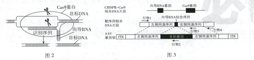 (4)基于细菌抵御外源病毒侵染机制,科研人员创设了CRISPR-Cas9基因编辑技术,原理如图2所示。CRISPR-Cas9与AAV病毒的结合使用可将目的基因靶向导入受体细胞,图3呈现部分原理。