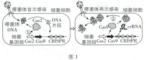 23. (12分)细菌抵御噬菌体的机理如图1所示:当某些细菌第一次被特定的噬菌体感染后,细菌Cas2基因开始表达出Cas2蛋白,Cas2蛋白会随机处理感染的噬菌体DNA,将其从内部切成多个DNA片段,并将其中一些片段插入图中所示细菌的CRISPR特殊位点。当同种噬菌体再次入侵时,细菌转录产生的crRNA便会将另一种蛋白质(如Cas9)准确带到入侵的噬菌体DNA处,并将之切断,从而抵御同种噬菌体的侵染。请回答下列问题: