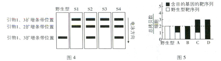 (4)①脱靶的原因是CRISPR - Cas9识别目的基因的特异性不强,向导RNA的识别序列越短,特异性越低,基因编辑的脱靶率越高。②非致病性DNA病毒可以用作基因工程的载体,将目的基因导入受体细胞。③分析题图3可知,引物1和引物2是分别根据载体与目的基因的序列设计的,在PCR体系中加入引物1和引物2扩增后能检测到条带说明目的基因成功导入靶序列DNA片段中。因为野生型没有目的基因,加入引物2无法扩增出条带。用引物1和3扩增能得到两种类型条带的结果说明同源染色体上只有一条染色体上导入了目的基因,因此,题图4中两条同源染色体上都导入了目的基因的细胞类型是S1和S3,因为S1和S3用引物1和3扩增的电泳结果只含有一个条带,且引物1和3扩增的电泳结果也显示有一种类型的条带,说明两条同源染色体都有目的基因插入。④据题图5所示,A组含有野生型靶序列和目的基因的靶序列,因此A组能扩增出2种不同大小的DNA片段,B组只含有目的基因的靶序列,因此只能扩增出1种DNA片段。D组的总拷贝数达到了3,且只含目的基因的靶序列,说明D组细胞中两条同源染色体上均导入了目的基因,且共导入了3个目的基因。