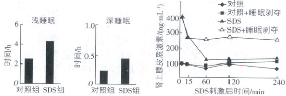 14. 将实验小鼠放入攻击性极强小鼠的领地,被多次攻击后,实验小鼠会出现“社交挫败应激”(SDS)。科学家发现,小鼠出现SDS现象,是因为VTA区被激活释放GABA(小分子化合物,抑制性神经递质)的神经元,使突触后神经元受抑制。还发现SDS显著升高会改变小鼠睡眠(睡眠主要分为浅睡眠和深睡眠),并对社交压力产生影响,结果如图。以下说法正确的是