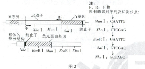 (3)进一步研究发现该患者体内有B蛋白能抑制γ基因表达。科研人员将少量B蛋白注入上述受体大肠杆菌,还是检测出有荧光,且并未衰减。科研人员继续研究证实,B蛋白抑制位置位于启动子上游的调控序列(M序列),请利用图2所示载体,通过检测大肠杆菌荧光变化,简要写出实验思路,验证此结论。