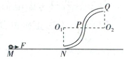 14. (14分)如图,游戏轨道由水平光滑直轨道$MN$和两个外切的半径为$R$的四分之一圆的光滑细圆管轨道$NPQ$组成(管的直径可忽略不计),$NP$与$MN$相切,在圆管轨道内的$N$点下表面和$Q$点的上表面装有微型压力传感器(图中没有画出)。可视为质点、质量为$m$的光滑小球在恒力$F = mg$的作用下从$M$点由静止出发,到$N$点时传感器的读数为$6mg$,此时撤去恒力$F$,小球继续沿着圆管轨道运动到$Q$点后水平抛出。已知重力加速度大小为$g$,求: