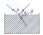 3. 如图所示,某种单色光从空气中经过$ A $点进入某种液体中,反射光与液面间的夹角为$ \alpha $,折射光与液面间的夹角为$ \beta $,已知$ \beta $与$ \alpha $之和为$ 105° $,$ \beta $与$ \alpha $之比为$ 4:3 $,下列说法正确的是 (