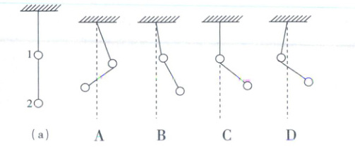 6. 如图(a)所示,用绳子悬挂两个质量为$ m $、$ 2m $,电荷量分别为$ -q $、$ +q $的小球1、2。现在该装置所在区域施加一斜向右上方的匀强电场,平衡后小球位置可能为 (