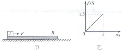 9. 如图甲所示,质量为$ 1.5 \, kg $的很薄的长木板$ B $静止在光滑水平地面上,在$ t = 0 $时刻,可视为质点、静止在长木板$ B $左端的质量为$ 0.5 \, kg $的物块$ A $在水平外力$ F $作用下开始运动,$ 3 \, s $后撤去外力$ F $,外力$ F $随时间变化的关系如图乙所示,物块$ A $与长木板$ B $间的动摩擦因数为$ 0.2 $,最大静摩擦力等于滑动摩擦力,重力加速度$ g $取$ 10 \, m/s^2 $,则 (