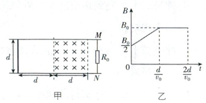 14. (12分)如图甲所示,两个平行金属导轨在同一水平面固定,间距为$ d $,连接电阻$ R_0 $,边长为$ d $的正方形区域存在竖直向下的匀强磁场,磁感应强度$ B $随时间$ t $变化关系如图乙所示。$ t = 0 $时,在距磁场左边界$ d $处,一长度为$ d $的均匀导体棒在外力作用下,以恒定速度$ v_0 $向右运动,直至通过磁场。导体棒阻值为$ R $,$ R_0 $的阻值为$ 2R $,其他电阻不计,棒与导轨始终垂直且接触良好。求:
