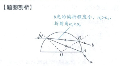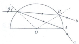 后分成$ a $、$ b $两束单色光,分别从$ A $、$ B $两处折射出半圆