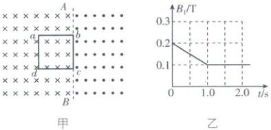7. 如图甲,固定在光滑绝缘水平面上的单匝正方形导体框 abcd,置于虚线 AB 左侧始终竖直向下、磁感应强度大小为 $ B_1 $ 的磁场中,bc 边与虚线 AB 重合,虚线 AB 右侧为竖直向上、磁感应强度大小为 $ B_2 = 0.2\ T $ 的匀强磁场。导体框的质量 $ m = 1\ kg $,电阻 $ R = 0.5\ \Omega $,边长 $ L = 1\ m $,$ B_1 $ 随时间 t 的变化图像如图乙所示。在 $ t = 1\ s $ 时,导体框解除固定,给导体框一个向右的初速度 $ v_0 = 0.1\ m/s $,下列说法正确的是 (