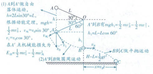 (1)小球从A到A'做自由落体运动(易错点:小球从A到A'是做自由落体运动,并不是圆周运动),下落的高度为$h=2L\sin30°=L(1$分)
