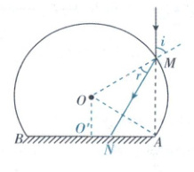 折射定律$n=\frac{\sin i}{\sin r}$,可得$r=30^{\circ}$,则$AN=AM\tan30^{\circ}=\frac{\sqrt{3}}{3}R$,