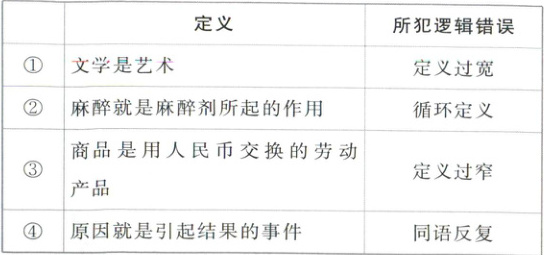 【深度解析】“文学”是“艺术”的一种子类,二者属于种属关系,该定义犯了“定义过宽”的逻辑错误,①正确。定义项与被定义项的外延必须全同。商品是用于交换的劳动产品,交换方式包括物物交换或任何货币交换,定义中限定“用人民币交换”,排除了其他交换方式,犯了“定义过窄”的逻辑错误,③正确。麻醉就是麻醉剂所起的作用,被定义项“麻醉”和定义项“麻醉剂所起的作用”都包含了“麻醉”这个词语,因此犯了“同语反复”的逻辑错误,②错误。“原因就是引起结果的事件”犯了“循环定义”(定义项间接包含被定义项)的逻辑错误,④错误。