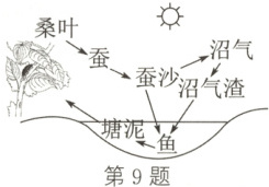 9. (生活实践)我国南方某些地区建立的“桑基鱼塘”模式是现代农业的典型,这种模式获得了鱼、蚕、桑、气的全面丰收。请据图回答问题: