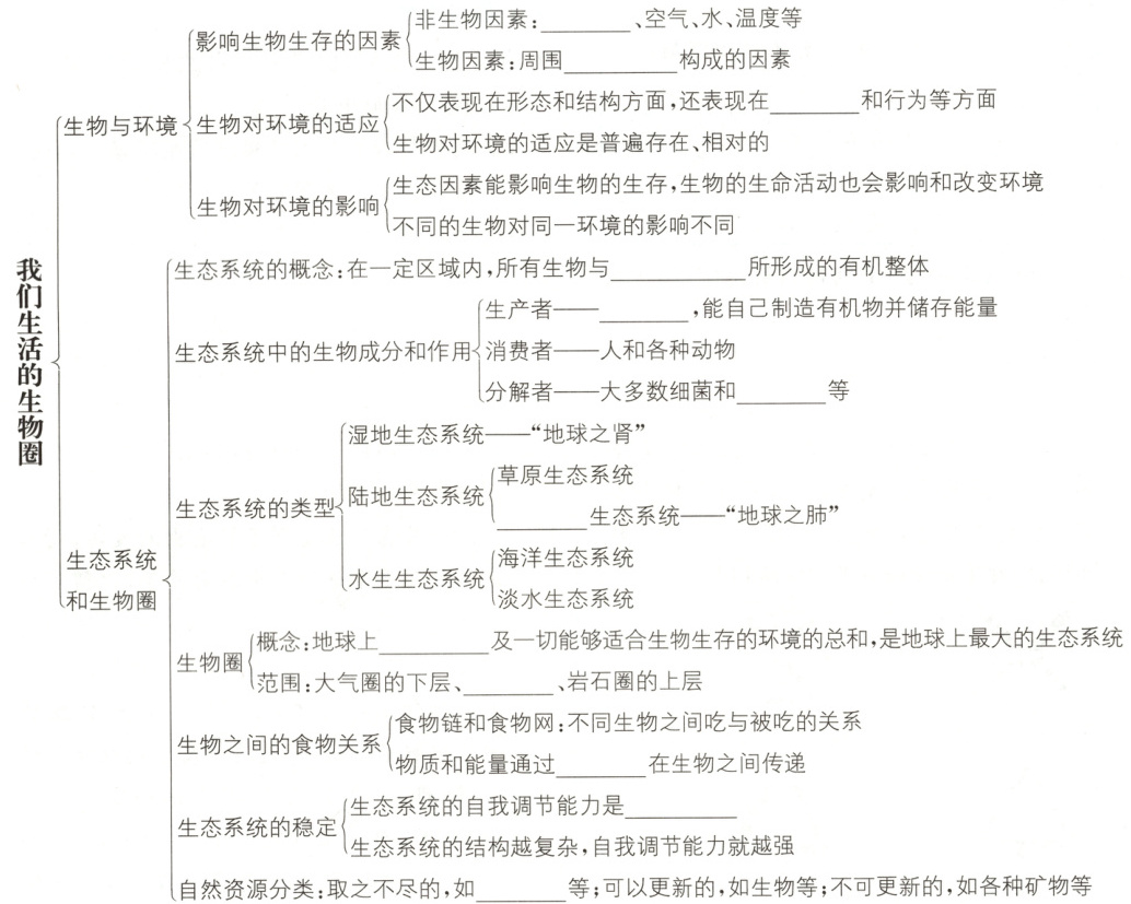 阳光;其他生物;生理;非生物环境;绿色植物;真菌;森林;所有生物;水圈;食物链和食物网;有限的;太阳能