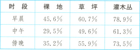 4. 在学校选取裸地、草坪、灌木丛三处不同的地点,每天早晨、中午、傍晚测量其周围的空气湿度,并计算平均值,结果如表所示。下列对