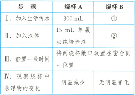 的摆动,几分钟后到达水槽另一侧。用吸管吸取无杂质的草履虫,注入培养液中培养备用。(2) 为了探究草履虫是否可以净化水质,同学们收集了生活污水,摇匀后分别加入两个烧杯中,实验步骤如下表所示。