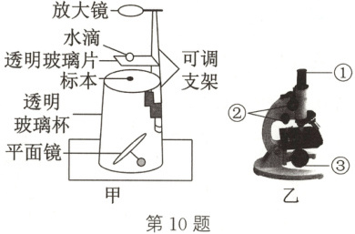 10. (跨学科)某小组利用水滴、放大镜、平面镜、透明玻璃杯和可调支架等制作了一台“水滴显微镜”(图甲)。调节支架高度,适当调整标本、水滴和放大镜三者之间的距离,可实现与图乙所示光学显微镜相似的成像效果。