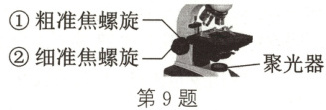 9. 如图是双目电光源显微镜部分结构示意图,其和普通光学显微镜的区别是反光镜换成了聚光器。下列叙述不正确的是 (