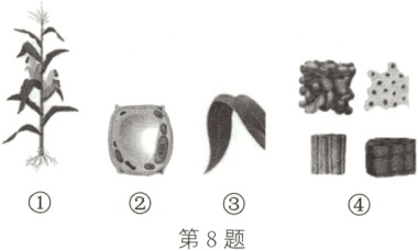 8. (2024·苏州)玉米是重要的粮食作物,如图为玉米各个结构层次的示意图,按照由小到大的顺序排列正确的是 (
