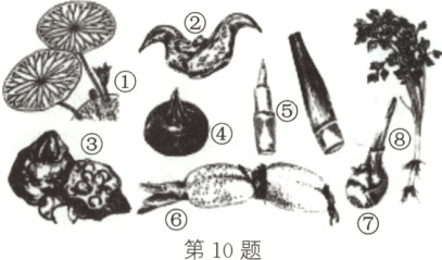 10. (新情境)苏州湿地资源丰富,可食用的水生植物中,最出名的是“水八仙”,如图所示。以下植物与其可食用部位对应错误的是(