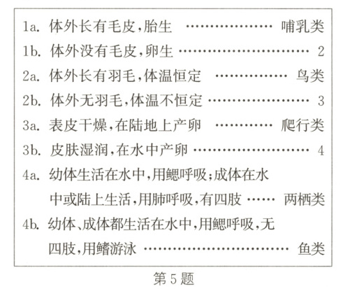 5. 生物检索表是根据生物某一方面的明显特征,按其异同有无分为相对的两组,然后按其相反的特征,继续分为相对的两组,如此反复细分,越分越细,直到可鉴定出该生物所属的类别为止。如图所示为脊椎动物检索表。请据图回答问题: